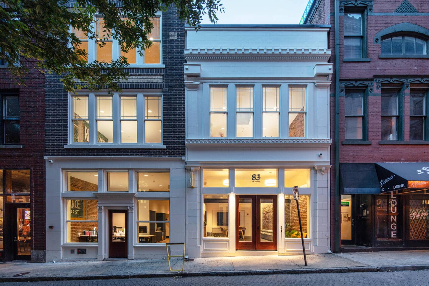 After many uses and tenants over the past century, these adjoining buildings on Poplar Street underwent a total rehabilitation and now function as a single office for Smith Dalia Architects. The goal of the rehabilitation was to remove years of unsympathetic alterations and to allow the historic character of the buildings to shine. On the exterior, historic portions of the commercial storefront were retained, repaired, and repainted. Much of the historic fabric on the interior had been lost over the years, so the rehabilitation removed most non-historic construction and highlighted the previously exposed masonry walls, including painted advertisements on a formerly exterior face of the adjacent building. The street-level storefronts provide a direct physical and visual connection between interior activities and passersby, allowing the historic relationship between the building and community to continue.