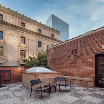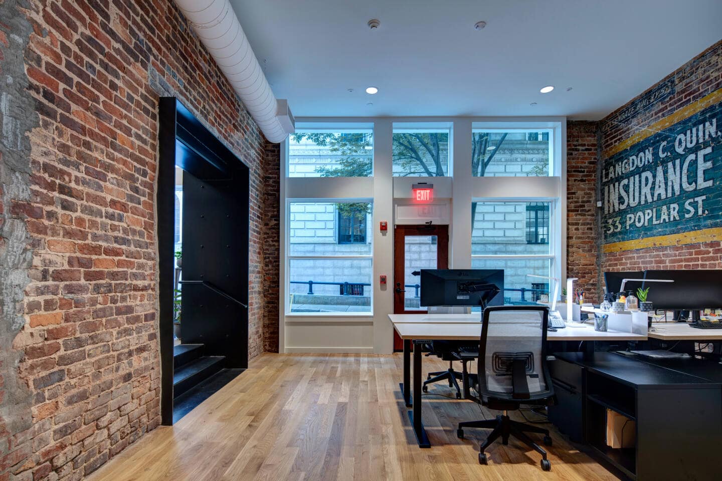 After many uses and tenants over the past century, these adjoining buildings on Poplar Street underwent a total rehabilitation and now function as a single office for Smith Dalia Architects. The goal of the rehabilitation was to remove years of unsympathetic alterations and to allow the historic character of the buildings to shine. On the exterior, historic portions of the commercial storefront were retained, repaired, and repainted. Much of the historic fabric on the interior had been lost over the years, so the rehabilitation removed most non-historic construction and highlighted the previously exposed masonry walls, including painted advertisements on a formerly exterior face of the adjacent building. The street-level storefronts provide a direct physical and visual connection between interior activities and passersby, allowing the historic relationship between the building and community to continue.